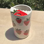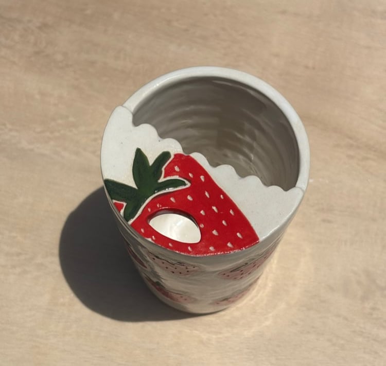 The seashell tumbler is a wheel thrown vessel made from a white clay. The lid is carefully attached and carved into a scalloped design. Each one is hand carved and painted.